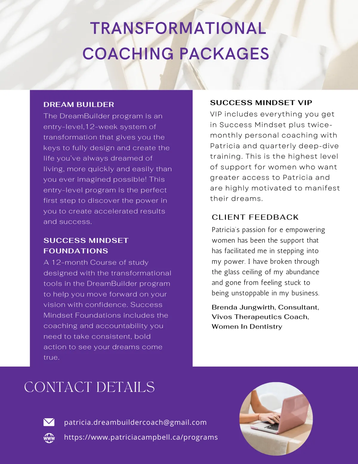 Reaching her breaking point at age 37, Patricia committed to creating the life she dreamed was possible. For the next 30 years, she immersed herself in personal growth and transformation, a journey that led her to study with world-renowned teachers Mary Morrissey, Lisa Nichols, and Dr. Claire Zammit. As a result, she is a certified transformational business and life coach and workshop facilitator.