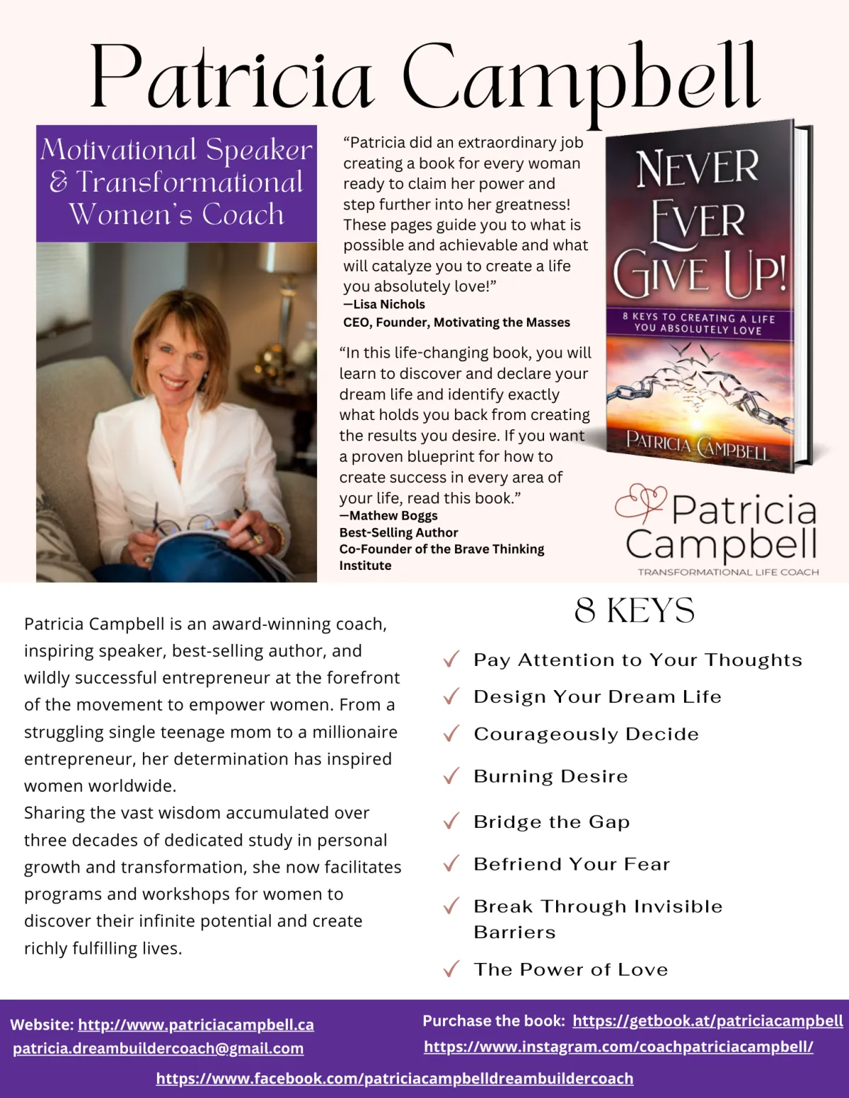 Drawing from a blend of timeless, universal laws and success principles, Patricia Campbell offers 8 comprehensive keys to ignite your power, outlining practical, actionable steps you can take today to manifest a rich, fulfilling life. Never Ever Give Up! will empower you to THRIVE!