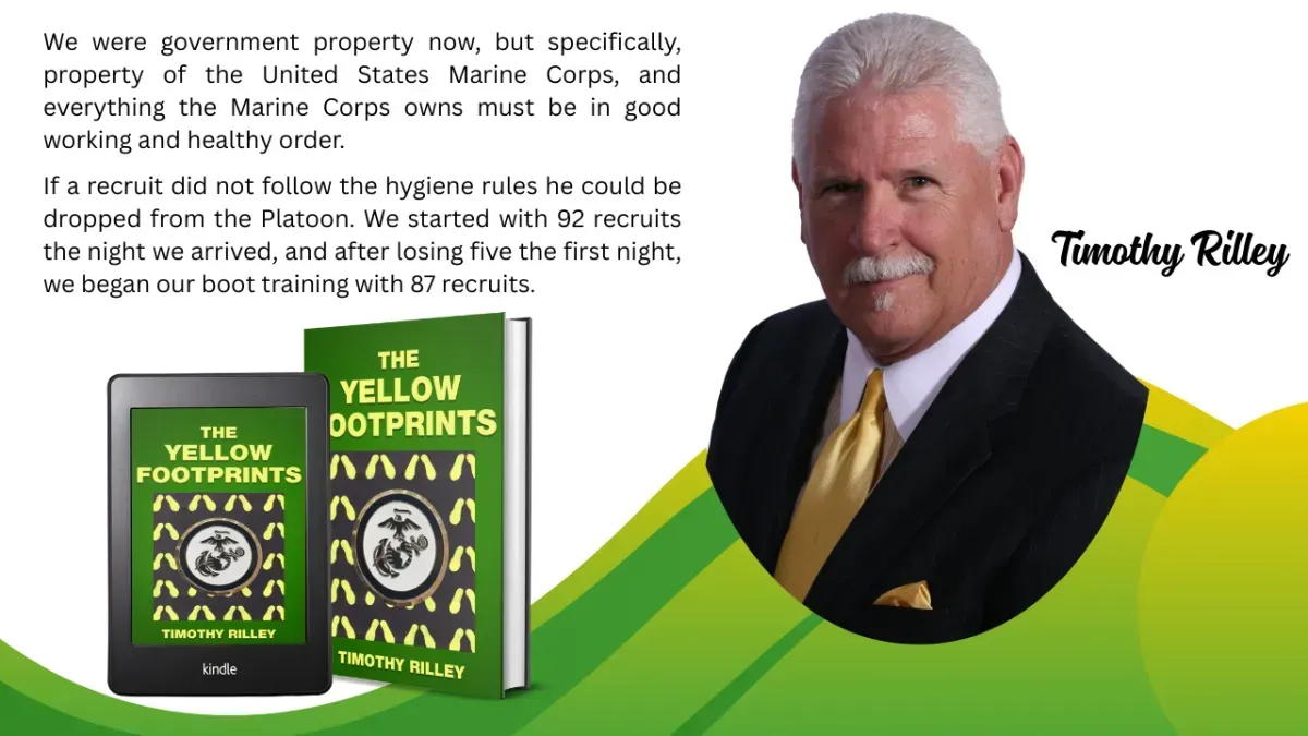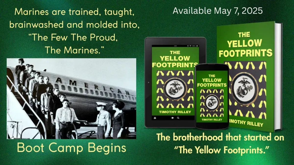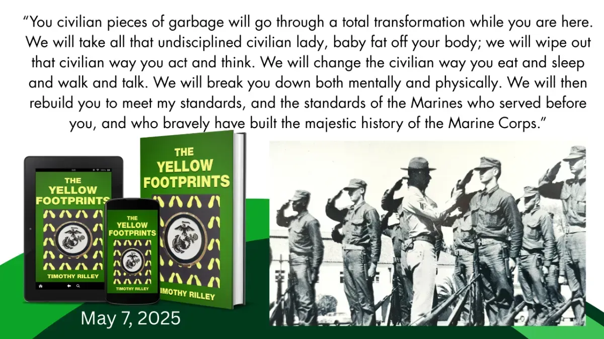 You exit the bus into the wet California evening. The air is heavy with fear and the acrid, unmistakable ring of screaming. Your own eyes, still wide with civilian incredulity, are drawn to the lines of colored yellow footprints on the ground. You're told to stand on them, heels together, feet at 45 degrees. In this instant, your former life ceases. You are no longer a college dropout, a boy, a boyfriend. You are a lowlife recruit.